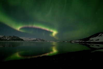 Illustration 2: Aurore boréale au dessus de la lagune glaciaire de Jökulsárlón en Islande. Crédits: Julien Morin