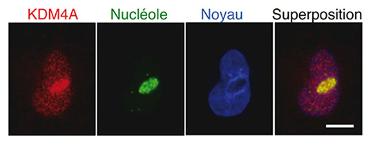 La chromatine est la forme sous laquelle se présente l'ADN dans le noyau des cellules eucaryotes. Elle est constituée de l'ADN associé à des protéines histones et non-histones. Un enjeu majeur en Biologie concerne l'identification des mécanismes épigénétiques impliqués au niveau de la chromatine dans le contrôle de l'expression des gènes ainsi que la compréhension de leur régulation par la cellule et leur coordination avec les conditions extra-cellulaires. L'histone-déméthylase KDM4A, également appelée JMJD2A, catalyse l'enlèvement des groupements méthyle sur les résidus lysine des protéines. Plus particulièrement, elle cible au niveau de la chromatine la lysine 9 de l'histone H3 di- et tri-méthylée, marque épigénétique répressive de la transcription des gènes. Ainsi, la méthylation/déméthylation au niveau de la lysine des protéines histones et non-histones a un rôle important dans la régulation de l'expression des gènes.Les chercheurs montrent que la protéine KDM4A s'accumule dans les nucléoles des cellules d'ostéosarcome (U2OS) en réponse au sérum où il est recruté au niveau des ADN ribosomiques (ADNr) pour déméthyler H3K9me3 et activer leur transcription. La voie de signalisation PI3K/SGK1 activée par le sérum est identifiée comme nécessaire à la translocation nucléolaire de KDM4A et à la transcription des ARN ribosomiques (ARNr).