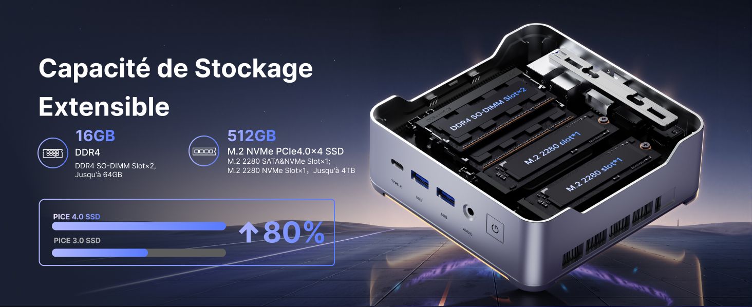 Le NiPoGi H2 s'appuie sur un processeur Intel Core i5-14450HX de 14e génération, avec 10 cœurs et 16 threads, pouvant atteindre 4,80 GHz. Ce processeur permet du montage vidéo, du rendu 3D ou du multitâche soutenu. Associé à 16 Go de mémoire DDR4 (extensible jusqu'à 64 Go) et à un SSD NVMe PCIe 4.0 de 512 Go, il offre une base solide pouvant évoluer par la suite.