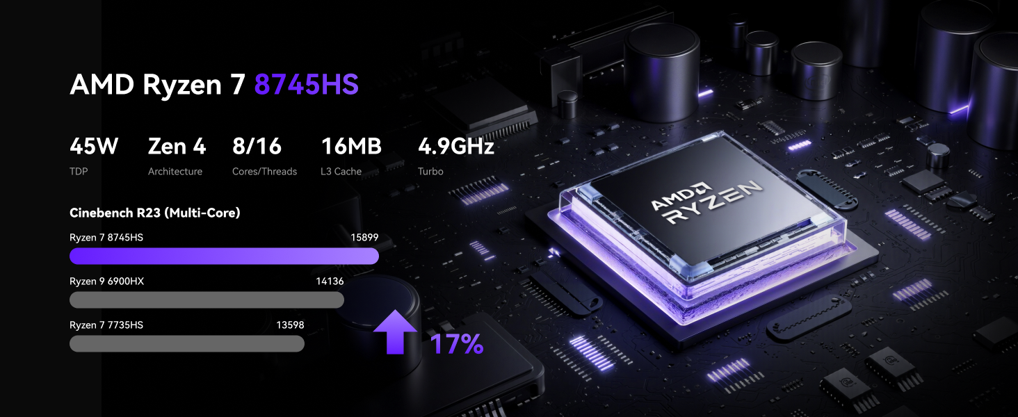 Le NiPoGi AM21 repose sur un processeur AMD Ryzen 7 8745HS (8 cœurs / 16 threads) basé sur l'architecture Zen 4, avec une fréquence pouvant atteindre 4,9 GHz. Il est associé à une partie graphique Radeon 780M, adaptée aux tâches graphiques soutenues et à certains usages ludiques. Cette configuration vise ceux qui souhaitent conjuguer productivité et polyvalence dans un format réduit.