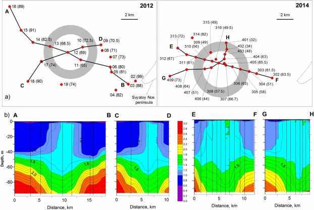 Mesures hydrographiques du 6 avril 2012 (transects A-B et C-D, à gauche) et du 3 et 4 avril 2014 (transects E-F et G-H, à droite) dans la région du cap Nizhneye Izgolovye du lac Baikal: a) cartes des stations avec les mesures d'épaisseur de la glace (en cm dans les parenthèses), les transects (lignes noires) et les anneaux (cercles gris) et b) sections verticales de la température de l'eau (°C).