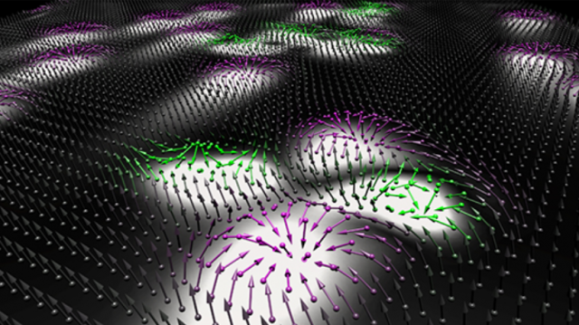 Les skyrmions, candidats prometteurs au stockage des données et aux technologies de l'information, sont des particules magnétiques nanométriques présentes à l'état excité au sein de matériaux métalliques (1) . En théorie, les skyrmions et leur antiparticule - les anti-skyrmions - possèdent une propriété appelée "charge topologique" impactant leur dynamique. Ainsi, lorsque skyrmions et anti-skyrmions sont soumis à une force entraînant une bifurcation de l'un vers la droite alors l'autre bifurquerait vers la gauche. Toutefois, cela reste à confirmer, c'est pourquoi une collaboration internationale impliquant des chercheurs du Centre de nanosciences et de nanotechnologies (C2N, CNRS/Université Paris-Sud) a modélisé le comportement de ces particules au sein d'un matériau ferromagnétique soumis à un courant électrique.