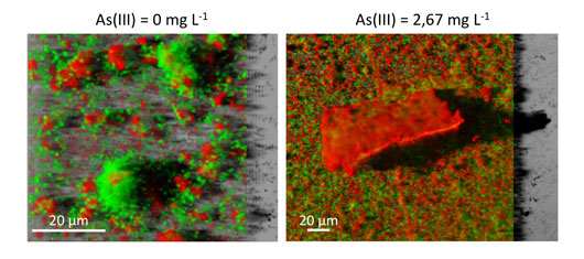 Les chercheurs de l'équipe "Ecophysiologie moléculaire des microorganismes" dirigée par Philippe Bertin au GMGM ont mené des expériences de microscopie confocale afin d'observer le comportement de ces bactéries lorsqu'elles sont soumises à des concentrations subinhibitrices d'arsenic sous sa forme la plus toxique, l'As(III). Les résultats montrent que la présence de ce composé chimique impacte grandement le développement de la structure en biofilm et affecte des fonctions bactériennes clés telles que la mobilité flagellaire et la synthèse de polysaccharides extracellulaires, qui s'amplifie.