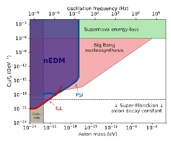 De telles oscillations ont été cherchées dans deux jeux de données recueillis dans l'expérience nEDM. Un premier jeu, pris à l'institut Laue Langevin entre 1998 et 2002, a permis de poser la meilleure limite en date sur la mesure moment électrique dipolaire du neutron. Malgré sa sensibilité intégrée plus faible, ce jeu de données couvre une plus grande période, ce qui le rend plus sensible aux basses fréquences (période de quelques mois à quelques années).Le second jeu de données a été pris au Paul Scherrer Institut entre 2015 et 2016 qui ont le record mondial de la plus grande sensibilité instantanée et cumulée sur la mesure du moment électrique dipolaire du neutron. De ce fait, elles sont extrêmement sensibles aux "hautes" fréquences (période de quelques minutes à quelques mois).