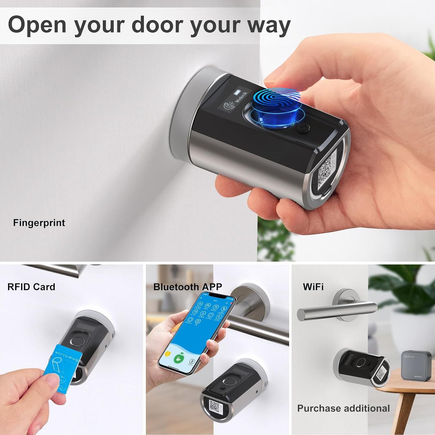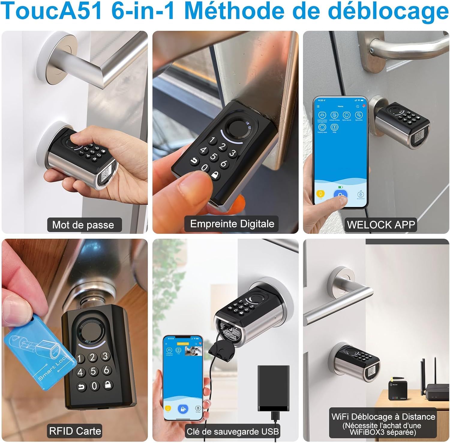 WELOCK Touca51 se distingue par sa polyvalence, en combinant plusieurs méthodes d'ouverture. En plus de l'empreinte digitale, elle intègre un clavier numérique et la prise en charge de cartes RFID, ce qui permet d'adapter l'accès à chaque utilisateur du foyer. Comme les autres modèles, elle s'installe sur un cylindre européen standard sans perçage en dix minutes.