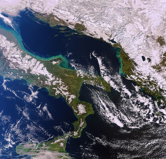 Cette portion de la péninsule italienne est entourée par les mers Tyrrhénienne (à l'ouest), Ionienne (au sud) et Adriatique (à l'est), qui font toutes partie de la mer Méditerranée. La couleurvert clair de l'eau sur le pourtour de la mer Adriatique provient des sédiments déversés dans la mer par les fleuves côtiers et dispersés le long des côtes par les courants.