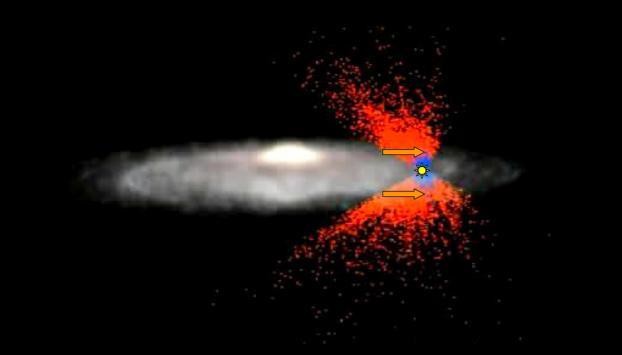 Le Soleil (en jaune) est situé à 25 mille années-lumière du centre de la Voie lactée. Les étoiles dont la vitesse a été mesurée par RAVE sont indiquées en rouge. Les flèches indiquent le mouvement vers l'extérieur repéré par les chercheurs de l'Observatoire de Strasbourg et leurs collègues.