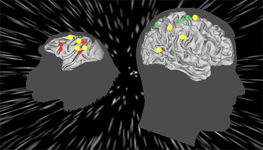 Dans ce domaine, les travaux menés par Andrew Smith et son équipe à la Royal Holloway University of London, ont permis d'identifier les aires cérébrales répondant plus spécifiquement à des stimulations visuelles présentant des mouvements proches de ceux reçus par nos rétines lorsque nous nous déplaçons. Parmi les régions sensibles à ces "flux optiques" chez l'Homme, certaines étaient attendues à la suite des travaux issus de la physiologie chez le singe macaque. D'autres, plus inattendues, n'ont pas d'homologue connu chez le primate non-humain. Ces différences reflètent-elles l'émergence de nouvelles aires sensibles au flux optique chez l'Homme, ou simplement le fait que des régions correspondantes n'ont pas encore été identifiées chez le singe ?