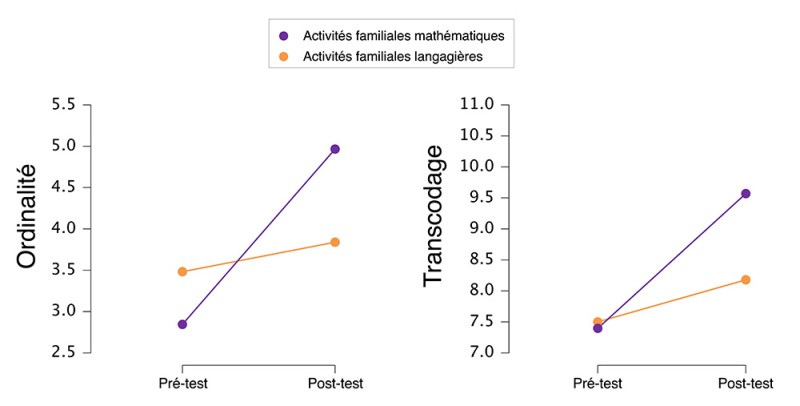 Effets de l'intervention sur deux compétences numériques: l'ordinalité (gauche) et le transcodage (droite), mesurées avant (pré-test) et après (post-test) les activités familiales. L'intervention ciblant les activités mathématiques (violet) entraîne une progression plus marquée que celle centrée sur le langage (orange), indiquant un effet spécifique de l'intervention sur les compétences numériques.
