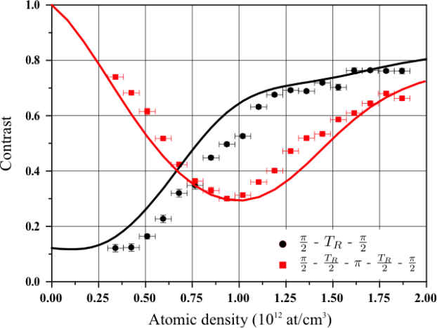 Evolution du contraste des franges de Ramsey en fonction de la densité atomique moyenne. Les carrés rouges et disques noirs correspondent respectivement à une séquence de Ramsey utilisant ou non la méthode de l'écho de spin. Les courbes correspondent aux résultats de notre simulation numérique. Le comportement non-monotone de ces courbes suggère une compétition inattendue entre l'écho de spin et le mécanisme d'auto-synchronisation des spins. Crédits : Physical Review Letters, 117, 163003, 14 octobre 2016