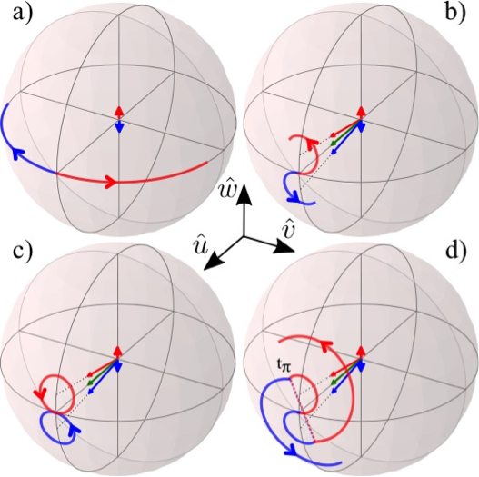 Illustration de la compétition entre les mécanismes d'écho et d'auto-synchronisation de spin. Deux classe d'atomes froids (bleu) et chauds (rouge) sont symbolisées par leur macrospin dont on représente la trajectoire sur la sphère de Bloch. (a) Sans interactions, les deux macrospins se déphasent dû à la non-inhomogénéité du potentiel de piégeage. (b) Avec interactions, les deux macrospins précessent désormais autour d'un champ magnétique effectif qui est la somme de l'inhomogénéité et du champ moyen de spin proportionnel au spin total (longue flèche verte) et se rephasent si aucune impulsion micro-onde n'est appliquée (c). Il s'agit de l'auto-synchronisation de spin. Si une impulsion micro-onde est appliquée lorsque les deux macrospins sont hors du plan équatorial, alors le rephasage est dégradé (d). Crédits : Physical Review Letters, 117, 163003, 14 octobre 2016