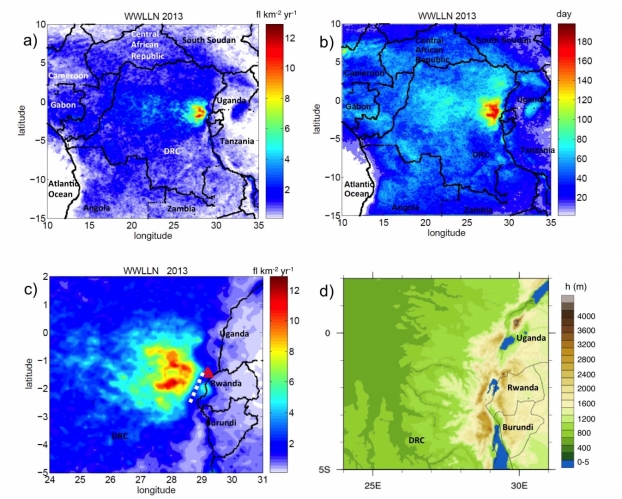 Densité d'éclairs détectés par WWLLN en 2013 avec une efficacité de 5.9 % (résolution de 0,1°), pour toute la zone étudiée (a) et pour la zone du maximum d'activité (c) où la ligne en pointillé blanc représente la chaîne de montagne des Mitumba et les deux triangles rouges deux volcans actifs. (b) Nombre de jours d'orages pour l'année 2013 (même résolution). (d) orographie dans la zone du maximum d'activité.