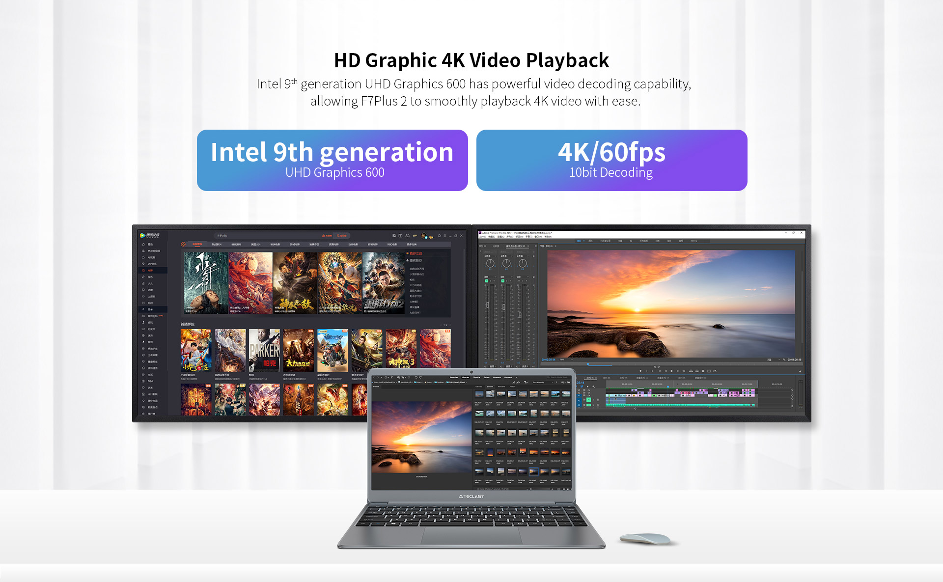 Marque de fabrique de Teclast, le Teclast F7 Plus 2 est très élégant par sa finesse et son logo éclairé. Il ne pèse que 1,3 Kg, vous pouvez donc l'emporter partout avec vous. Sous le capot, le Teclast F7 Plus 2 embarque un chipset quad-core Intel Gemini Lake N4100 avec une fréquence de boost allant jusqu'à 2,60 GHz. Coté graphisme, il s'agit de chipset Intel UHD Graphics 600. Un disque SSD de 256 Go et 8 Go de mémoire RAM complètent le tableau. Il est doté d'un écran de 14 pouces Full HD (avec une résolution de 1920 x 1080) et, côté système d'exploitation, de Windows 10.