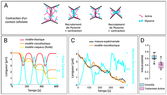Les chercheurs ont utilisé l'embryon de drosophile comme système modèle pour explorer cette question. Pendant l'embryogenèse de la drosophile, les contacts cellulaires alignés avec l'axe dorso-ventral activent la Myosine de façon pulsatile, permettant leur contraction par paliers, ce qui a pour effet d'allonger le tissu dans l'autre direction (antéro-postérieure). En analysant conjointement l'activité de la Myosine, responsable de la force contractile, et la dynamique de contraction des contacts cellulaires, ils ont mis en évidence que les impulsions les plus courtes génèrent des déformations plus réversibles que les impulsions les plus longues. Ils ont par ailleurs analysé la réponse des contacts cellulaires à des forces extrinsèques exercées plus ou moins longtemps par l'application de "pinces optiques" utilisant des lasers focalisés à proximité des contacts, et observé le même comportement.