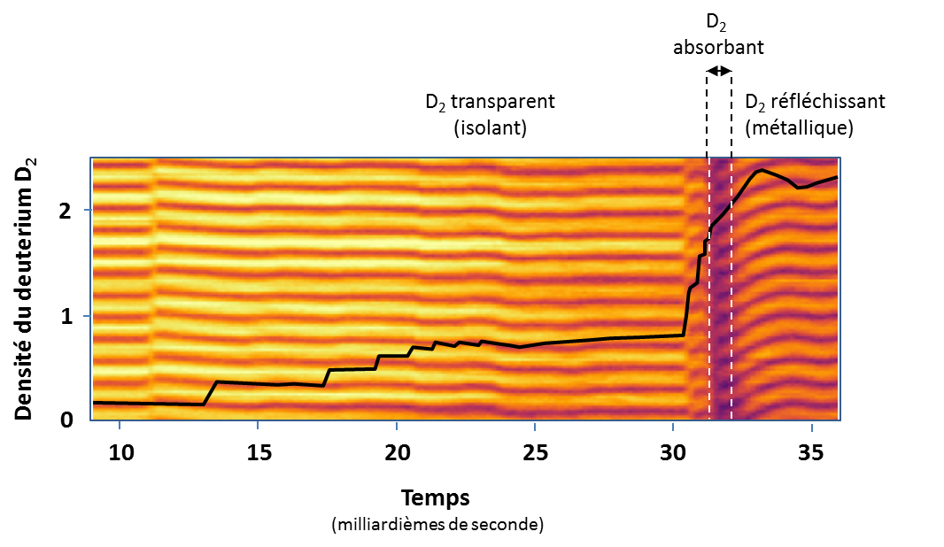 Le défi a alors consisté à concevoir une expérience qui pourrait comprimer dynamiquement un échantillon d'hydrogène fluide à plusieurs millions d'atmosphères de manière suffisamment douce (sans choc fort) pour qu'il reste froid ou en-dessous de 2 000 kelvin, et acquérir des données permettant de discriminer entre les différents modèles théoriques. La série d'expériences réalisées a permis d'obtenir, grâce notamment à la grande qualité des signaux enregistrés, une signature claire de la transition métallique et d'identifier dans le domaine pression-température, les conditions précises auxquelles a lieu la transition.