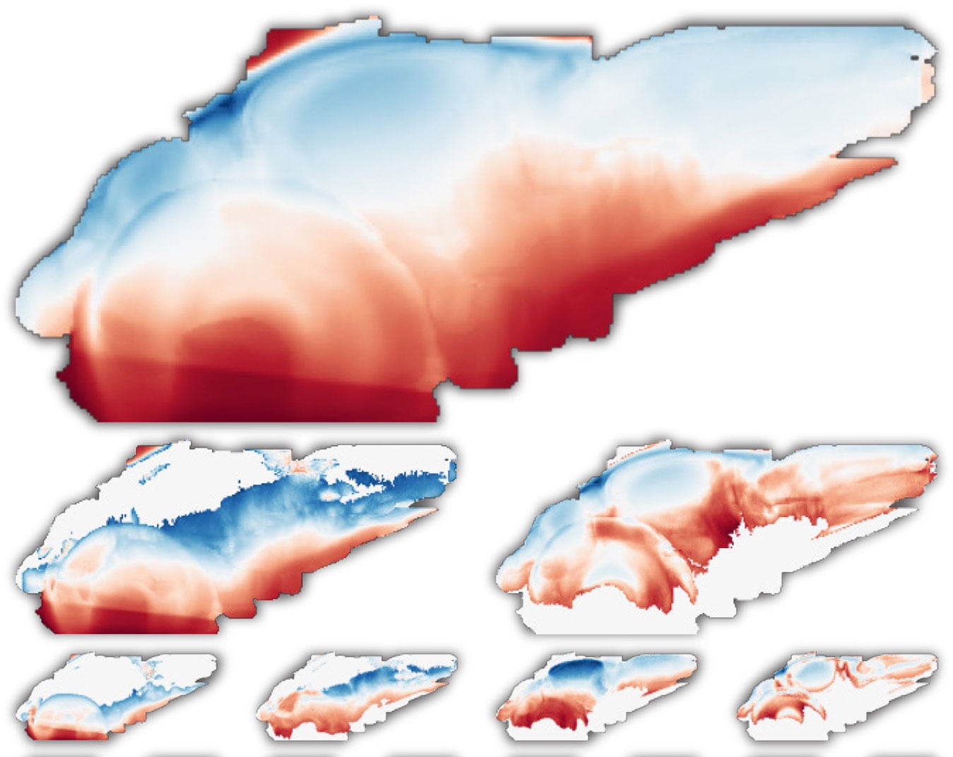 Les neuroscientifiques ont suivi les motifs d'expression génique dans deux régions adjacentes du cerveau du poisson-zèbre, colorées en rouge et bleu. Crédit: Zador lab/CSHL