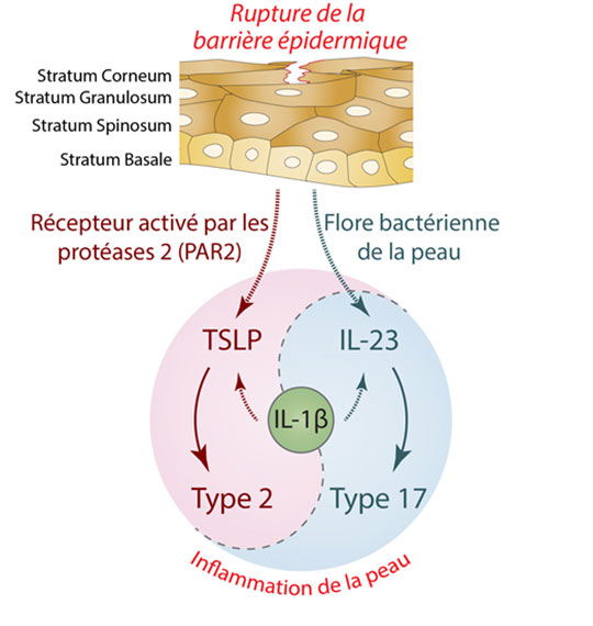 Les chercheurs ont altéré la barrière épidermique dans un modèle de souris grâce à une mutation inductible de la cornéodesmosine3, affaiblissant l'adhérence des cellules de la couche cornée, appelées les cornéocytes. Cette mutation a été identifiée chez des patients atteints du "peeling skin syndrome de type B". Ce modèle a permis aux chercheurs d'analyser la dynamique de l'inflammation cutanée dans le cas de rupture de la barrière épidermique afin de mieux comprendre les réseaux de cytokines sous-tendant le processus inflammatoire. Les chercheurs ont observé dans un premier temps que, lors d'une rupture de la barrière épidermique, la peau développe des réponses inflammatoires de type 2 et 17, respectivement entrainées par la synthèse des cytokines TSLP et l'interleukine (IL)-23. Ils ont aussi montré que l'induction de ces cytokines dépend de signaux différents et que les réponses de type 2 et de type 17 se contre-régulent mutuellement. Finalement, l'interleukine-1? (IL-1?) est fortement impliquée dans la régulation de la production de TSLP et d'IL-23.
