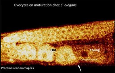 Référence: Carbonylated Proteins are Eliminated During Reproduction in C. elegans, Jérôme Goudeau and Hugo Aguilaniu, Aging Cell, Volume 9, Issue 6, pages 991-1003, December 2010