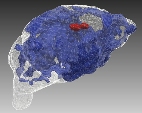 Modèle 3D du cerveau néonatal montrant les régions où la croissance est réduite (en bleu) et celles où elle est accrue dans les ventricules (en rouge). (Source: Lani Cupo)