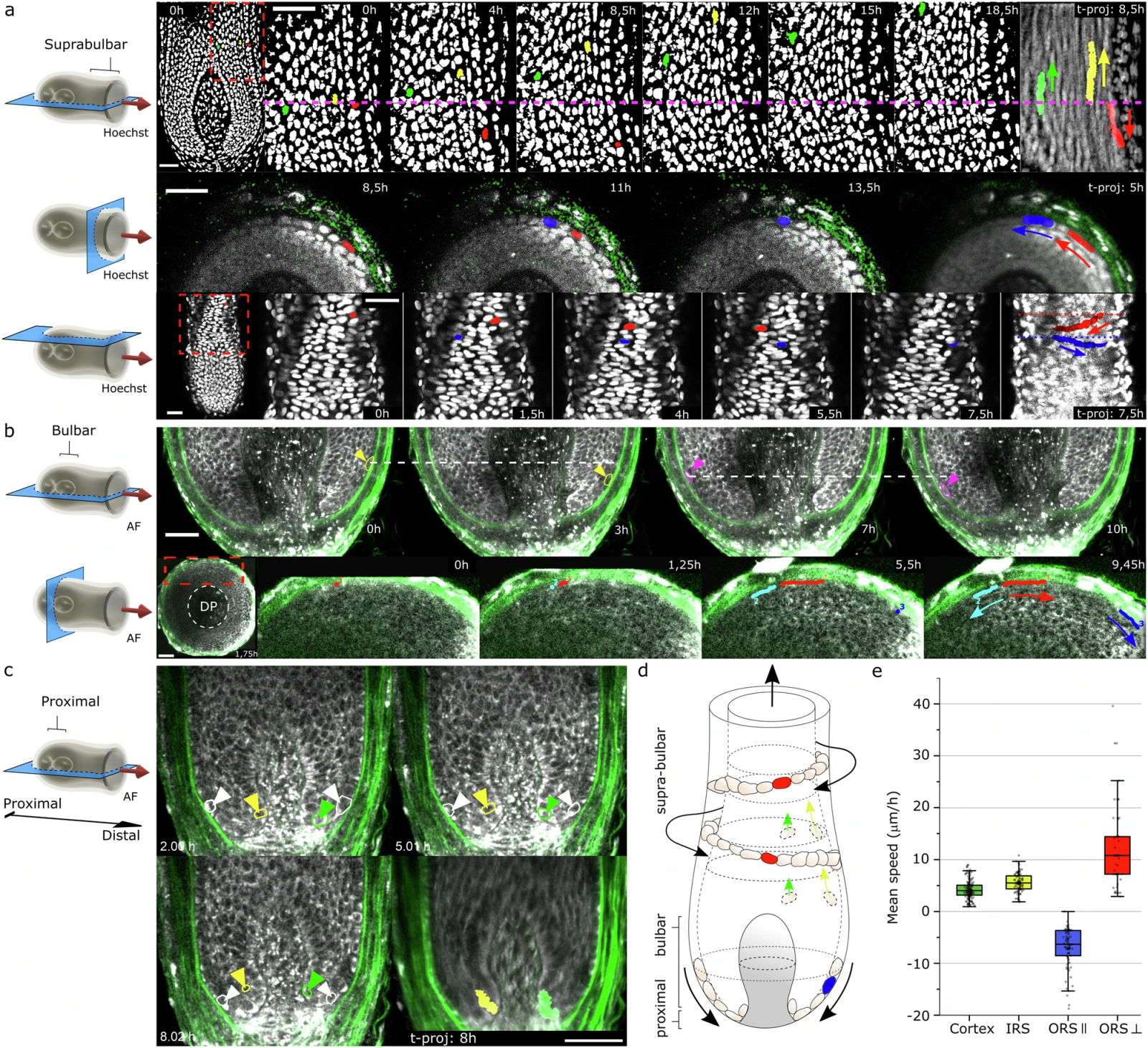 d: Schéma récapitulatif des mouvements observés. Selon leur position, les cellules ORS se déplacent soit parallèlement à l'axe du follicule, soit perpendiculairement autour du bulbe.
