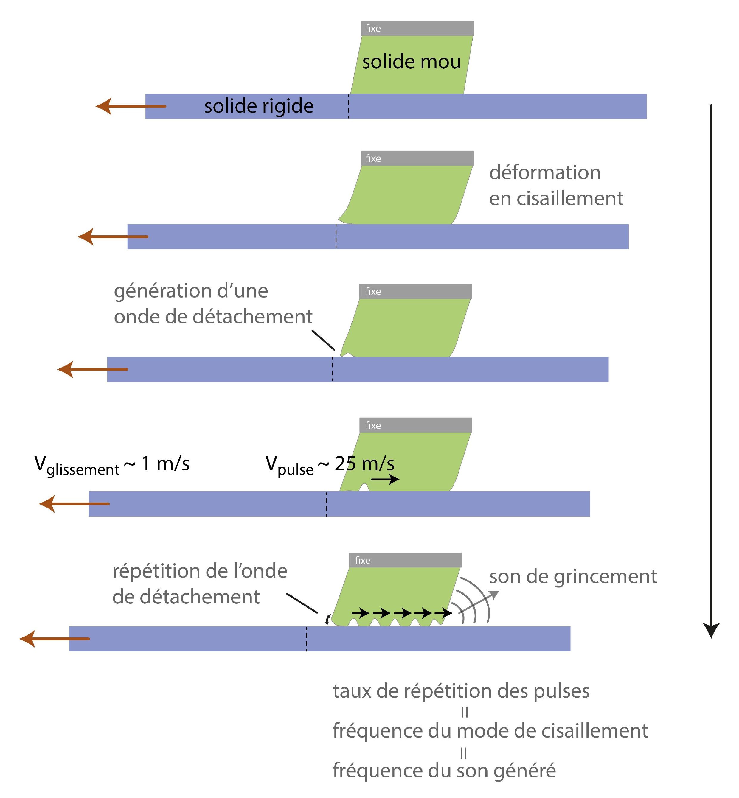 Représentation schématique des phénomènes en jeu dans l'expérience de grincement lorsqu'un solide mou est glissé sur une surface rigide.