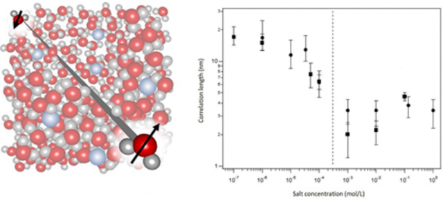 La quantité de photons harmoniques indique que les molécules d'eau s'organisent sur des distances beaucoup plus grandes que ce qui était jusqu'à présent admis. Elles s'arrangent ainsi sur plusieurs dizaines de nanomètres selon une distribution azimutale: si l'une pointe vers une direction, l'autre est orientée à l'opposé. Ces travaux montrent aussi que, lorsque l'on ajoute du sel, une transition apparaît. Les molécules d'eau adoptent brutalement une distribution radiale à courte distance, centrée sur les ions du sel.