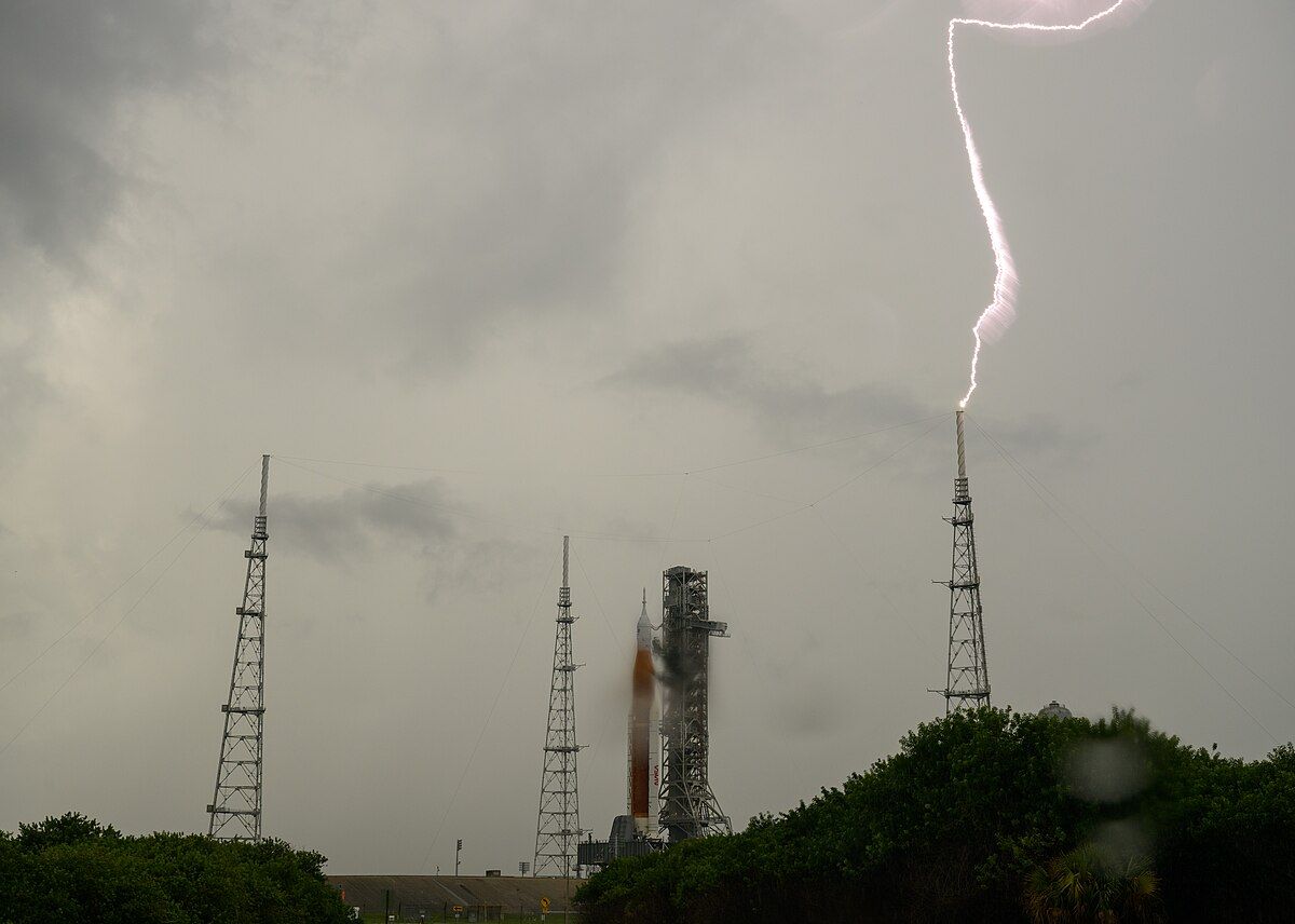 Un éclair frappe un paratonnerre autour du lanceur Artemis I de la NASA. Image Wikimedia
