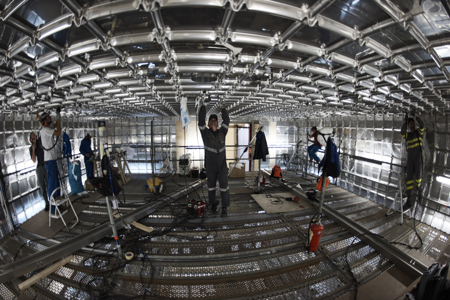 Travaux à l'intérieur du prototype de DUNE (ProtoDUNE). Les panneaux métalliques formeront un réservoir pour l'argon liquide dans lequel des électrons et des photons seront créés au passage de particules. (Image: Maximilien Brice, Julien Ordan/CERN)