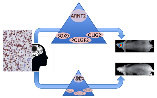 L'identification des gènes associés à un changement de marques d'histone a permis de révéler un réseau de facteurs de transcription liés au comportement cancéreux, à l'état souche et au développement neuronal, ainsi qu'une association insoupçonnée entre la répression du facteur de transcription ARNT2 et la perte de tumorigénicité cellulaire. Chez les patients, l'expression d'ARNT2 prédomine dans les zones prolifératives de la tumeur. Inversement l'inhibition de l'expression d'ARNT2 supprime la capacité des cellules à former une tumeur quand elles sont greffées in vivo. ARNT2 est donc nécessaire à la tumorigénicité des cellules, notamment en contrôlant l'expression de trois facteurs de transcription pro-tumorigènes, SOX9, POU3F2 et OLIG2. ARNT2 se révèle donc être un composant essentiel du réseau de facteurs de transcription responsable de l'agressivité des cellules de glioblastome.