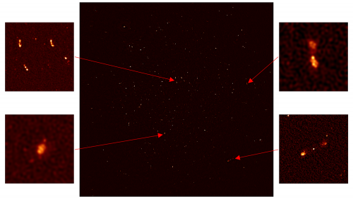 Sur une petite portion du ciel représentant moins de 0,01% de la sphère céleste, l'image de première lumière de MeerKAT dévoile plus de 1 300 galaxies de l'univers lointain, sur lesquelles seulement 70 étaient déjà connues.