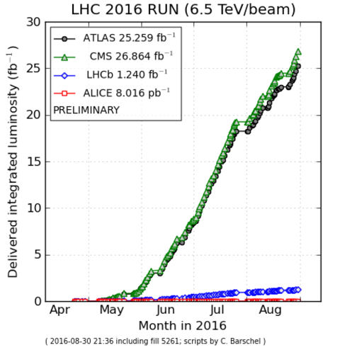 La semaine dernière, à ATLAS comme à CMS, la luminosité intégrée accumulée a atteint les 25 fb^-1, l'objectif fixé pour 2016.