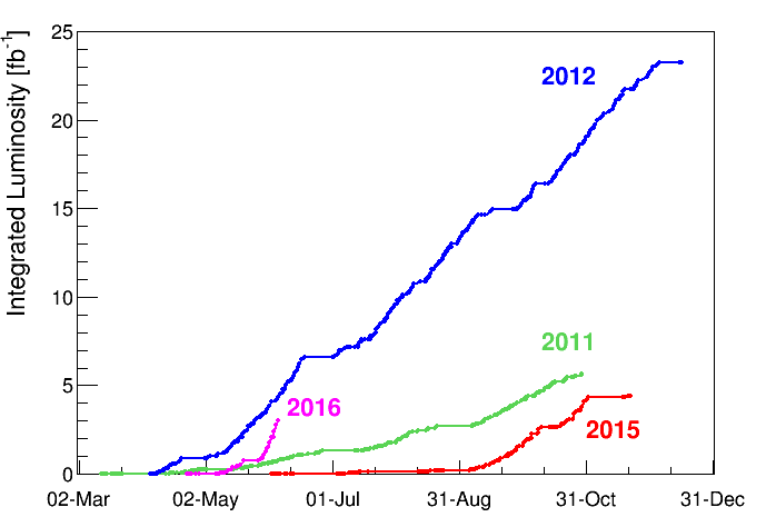 Luminosité intégrée du LHC en 2011, 2012, 2015 et 2016.