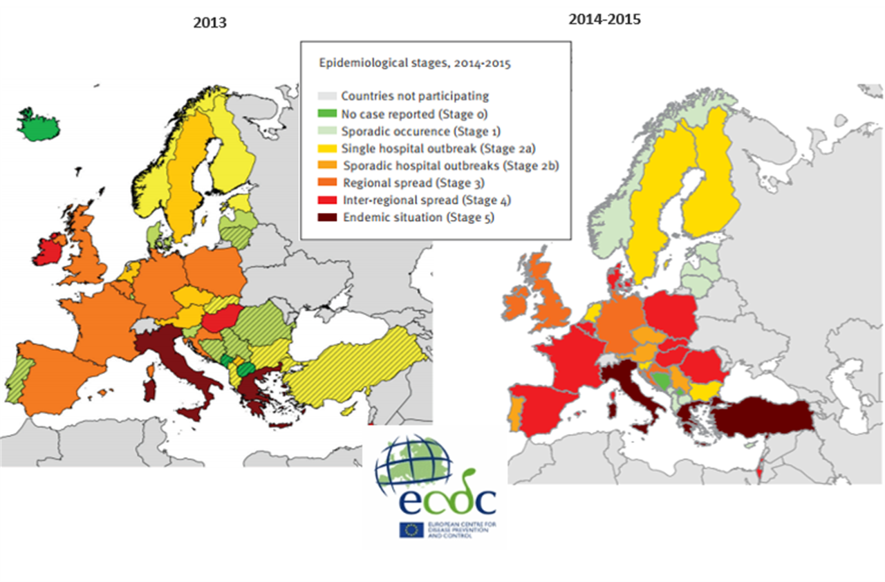 [i]Aperçus de la dissémination des caractères de résistance aux antibiotiques (β-lactamines) en Europe (à gauche: dissémination de la résistance aux β-lactamines ; à droite: dissémination de la résistance aux carbapénèmes. Sources: European Centre for Disease Prevention and Control