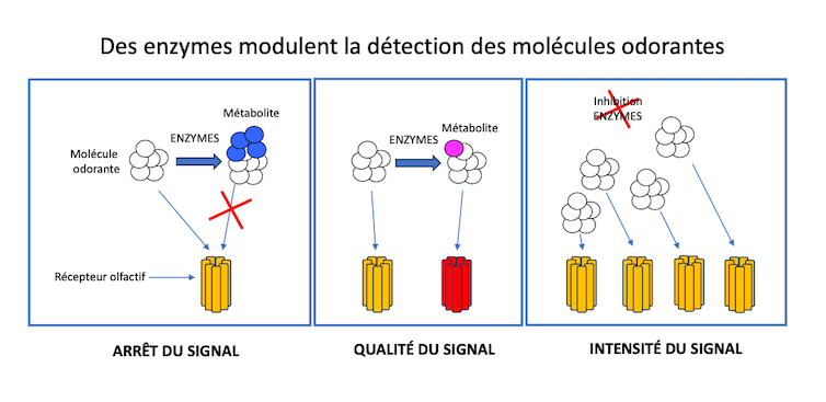 La détection olfactive par les récepteurs est essentielle mais le contrôle de la disponibilité des molécules odorantes pour ces récepteurs l'est tout autant. C'est le rôle de certaines enzymes présentes dans l'environnement des récepteurs sur lequel mon équipe travaille. Les enzymes sont des protéines qui accélèrent les réactions chimiques nécessaires au fonctionnement des cellules. L'enzyme qui nous intéresse se trouve dans les cellules des tissus de la cavité nasale et, comme un récepteur olfactif, elle est capable de fixer des molécules odorantes mais sa fonction est de les modifier. Elle n'est pas seule, de nombreuses enzymes prennent en charge la grande variété de molécules odorantes.