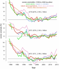 Série temporelle des anomalies observées de la moyenne zonale annuelle de la concentration d'ozone à ~40 km (haute stratosphère) aux tropiques et aux latitudes moyennes des 2 hémisphères. Les données proviennent de mesures satellite: SAGEII+OSIRIS (bleu clair), produits fusionnés GOZCARDS (vert) et produits SBUV fusionnées par la NASA (rouge) et NOAA (rose). Les anomalies sont calculées en prenant 1998-2008 comme période de référence. Les courbes orange représentent la variation inversée de la teneur en "chlore effectif équivalent dans la stratosphère" (EESC) qui est un indicateur de la concentration stratosphérique d'halogènes (chlore, brome). Cette variation inversée d'EESC est mise à l'échelle dans chaque figure pour refléter la variation attendue de l'ozone associée aux variations des halogènes stratosphériques.