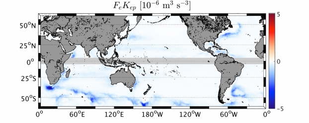 Le couplage mécanique entre l'océan et l'atmosphère génère des puits d'énergie des courants géostrophiques à méso-échelle vers l'atmosphère. Ce transfert d'énergie peut être exprimé via le travail du vent à méso-échelle ("eddy windwork") estimé à partir de l'énergie cinétique et du coefficient de couplage. Un FeKep négatif indique un transfert d'énergie des tourbillons vers l'atmosphère qui induit une réduction de l'activité méso-échelle d'environ 30 % à l'échelle globale.