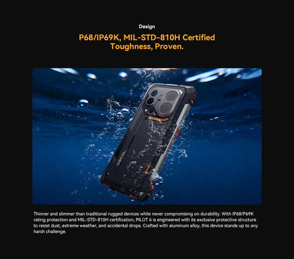 Le Pilot 6 se distingue d'abord par sa conception robuste. Il bénéficie des certifications IP68 et IP69K ainsi que de la norme militaire MIL-STD-810G, ce qui lui permet de résister à l'eau, à la poussière et aux environnements difficiles. Ce positionnement en fait un appareil adapté aux activités extérieures, aux chantiers ou aux déplacements en conditions exigeantes.