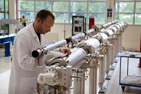 L'accélérateur d'électrons de European XFEL est unique dans le paysage des sources de lumière: il est le seul à utiliser la supraconductivité. Sa construction a été prise en charge par un consortium d'instituts européens basés principalement en Allemagne, en Russie, en France, en Italie, en Espagne, en Pologne et en Suisse. En France, au-delà des futurs projets qui seront menés par des chercheurs coordonnés par le CNRS, le Laboratoire de l'accélérateur linéaire (CNRS/Université Paris-Sud) a plus particulièrement été chargé du suivi de la production et du conditionnement de tous les coupleurs de puissance (4), composants essentiels des accélérateurs linéaires de particules. Ce travail a nécessité un transfert de savoir-faire de certaines étapes de la préparation des coupleurs vers les industriels, ainsi qu'une collaboration étroite avec ces derniers pour garantir la qualité requise du produit fini. Une infrastructure adaptée à la production de masse des coupleurs, unique au monde, a été installée au laboratoire permettant d'atteindre une cadence de conditionnement de 8 à 10 coupleurs par semaine. Les coupleurs conditionnés ont été ensuite envoyés à l'Institut de recherche sur les lois fondamentales de l'univers du CEA (Paris-Saclay) pour être assemblés dans 103 "cryomodules". Pour ce travail d'intégration dont il avait la charge, le CEA a accompli un transfert industriel de son savoir-faire vers la société Alsyom, formalisé en juillet 2012, et s'est doté d'une infrastructure dédiée à Saclay, ce qui a permis d'atteindre une cadence d'assemblage d'un cryomodule tous les quatre jours, tout en maintenant les performances techniques exigées. Après 8 ans d'efforts, l'analyse des performances des coupleurs et cryomodules, réalisée par le laboratoire pilote basé en Allemagne (le DESY), confirme un savoir-faire unique au monde des scientifiques français.