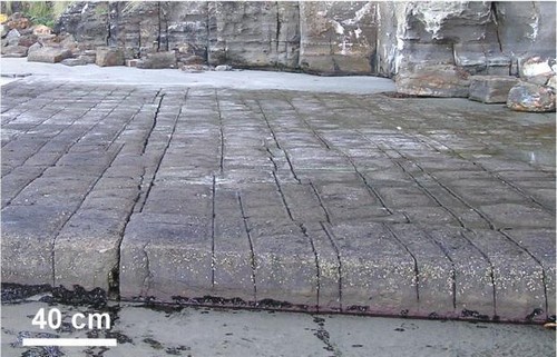 Réseau de diaclases dans un banc de grés (Eaglehawk Neck, Tasmania).