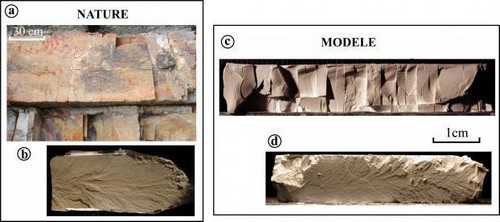 Réseaux de diaclases (en coupe) et morphologie de leurs surfaces dans la nature et le modèle physique (Jorand et al., sous presse).