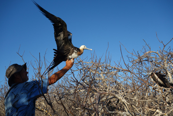 Oiseau marin énigmatique car difficilement observable, la frégate du Pacifique (Fregata minor) est très légère et dotée d'ailes très longues et très larges, ce qui lui confère une capacité exceptionnelle à planer et monter dans les courants d'air ascendants sans battre des ailes. Avec la période d'élevage des jeunes la plus longue de tous les oiseaux et son incapacité à se poser sur l'eau (2) (alors qu'elle dépend entièrement de poissons volants qu'elle doit capturer en vol), la frégate constitue un sujet de choix pour le projet de recherche Early life (3) centré sur l'étude des comportements de jeunes prédateurs marins. C'est pourquoi une équipe de chercheurs a mené un important programme de marquage sur les frégates depuis l'île d'Europa dans le canal du Mozambique, haut lieu de reproduction de l'espèce. Une cinquantaine de spécimens adultes et juvéniles ont été équipés de capteurs autonomes, capables de mesurer simultanément et pendant des mois la position GPS, l'altitude, la fréquence cardiaque et le battement des ailes des frégates étudiées. Ces données permettent de décomposer le vol de l'oiseau, de déterminer s'il bat des ailes ou s'il plane et d'en déduire son mouvement et ses dépenses énergétiques.