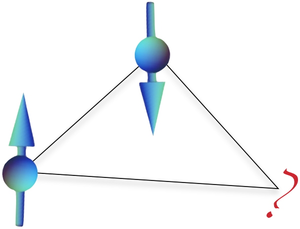 Figure 1: Illustration de la frustration géométrique dans les matériaux où les atomes magnétiques occupent les sommets d'un triangle. Lorsque les moments magnétiques interagissent de façon antiferromagnétique (ils tendent à pointer dans une direction opposée à leur plus proche voisin), alors, dans le cas ou deux spins sont antiparallèles, le troisième spin ne peut pas satisfaire simultanément les interactions avec les deux autres. La frustration empêche ainsi les moments magnétiques de s'ordonner de façon antiparallèle lorsqu'ils sont soumis à une très basse température.