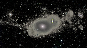 Les chercheurs(1), tous membres de l'équipe internationale Atlas3D, ont montré que ces deux galaxies elliptiques sont nées de la "fusion" de deux grosses galaxies spirales, il y a seulement 1 à 3 milliards d'années. Au cours de cet évènement majeur, une partie de la matière des galaxies en "collision" a été éjectée et a formé des débris stellaires. Les filaments de gaz et d'étoiles, qui ont été détectés par le TCFH, forment deux grandes queues de part et d'autre de la galaxie s'étendant en tout sur plus d'un million d'années-lumière (plus de 10 fois le diamètre de la Voie lactée). C'est la plus grande structure stellaire jamais détectée, qui n'a pas été dévoilée plus tôt car leur luminosité est faible et leur étalement important. Ces filaments ont été formés lors des rencontres entre galaxies spirales, par un mécanisme gravitationnel similaire à celui des marées océaniques, d'où leur nom de "queues de marée".