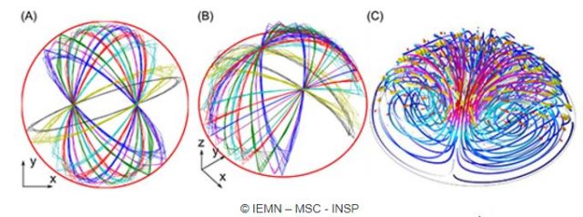 Galerie des murmures dans une gouttelette. (A-B) trajectoire des rayons acoustiques guidés par la surface de la goutte. (C) Simulation des courants acoustiques générés par les galeries des murmures.
