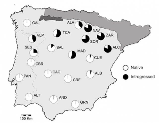 La fréquence de génomes mitochondriaux d'origine arctique chez le lièvre ibérique. Sur cette carte de la péninsule ibérique, la zone gris clair représente l'aire de distribution actuelle du lièvre ibérique (Lepus granatensis). Chaque camembert donne la fréquence, dans une population de cette espèce, d'individus porteurs de la mitochondrie du lièvre variable, L. timidus (secteur noir du camembert). On ne les trouve que dans la moitié nord de la péninsule, avec une fréquence croissante en s'approchant des Pyrénées. Le lièvre variable était présent dans le nord de la péninsule à la fin de la dernière glaciation, et le lièvre ibérique l'a progressivement remplacé depuis son refuge méridional, à la faveur du réchauffement climatique. Nous voyons ici les "fantômes" de l'hybridation qui a accompagné cette invasion. D'après doi: 10.1038/srep40788 (2017).Crédit: Pierre Boursot