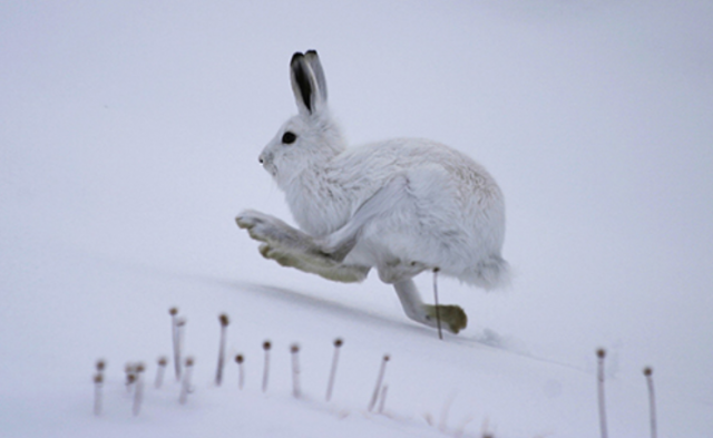 Le lièvre variable (Lepus timidus) dans son pelage hivernal, le rendant moins visible par les prédateurs sur la neige. Crédit: Claudio Spadin