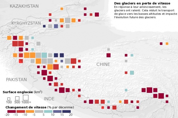 Les glaciers qui recouvrent les montagnes les plus élevées du monde alimentent les fleuves d'Asie, ressources en eau pour plusieurs centaines de millions de personnes. Alors que la planète se réchauffe, il est important de comprendre comment ces glaciers répondent aux changements climatiques, pour mieux anticiper leur contribution future aux ressources en eau. Trente années d'images satellitaires apportent un nouvel éclairage sur l'évolution de ces glaciers. Une équipe internationale s'est attachée à traiter plusieurs millions d'images satellites pour quantifier l'écoulement des glaciers des Hautes Montagnes d'Asie (HMA). Les résultats sont clairs, ces glaciers ont nettement ralenti au cours des deux dernières décennies.