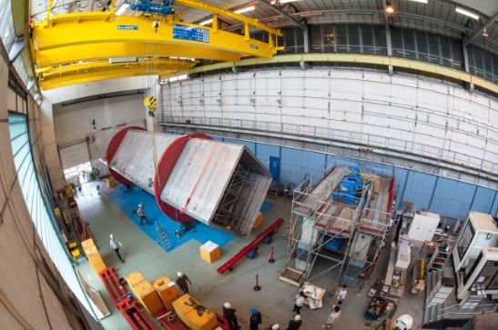 La soudure des panneaux qui constituent le cryostat est extrêmement délicate et doit être réalisée à plat. Pour y parvenir, l'équipe du CERN doit faire pivoter l'ensemble du cryostat pré-assemblé, comme sur une broche géante. À la fin du processus, qui prendra plusieurs mois, le cryostat sera prêt à accueillir le détecteur. (video: Maximilien Brice/CERN)