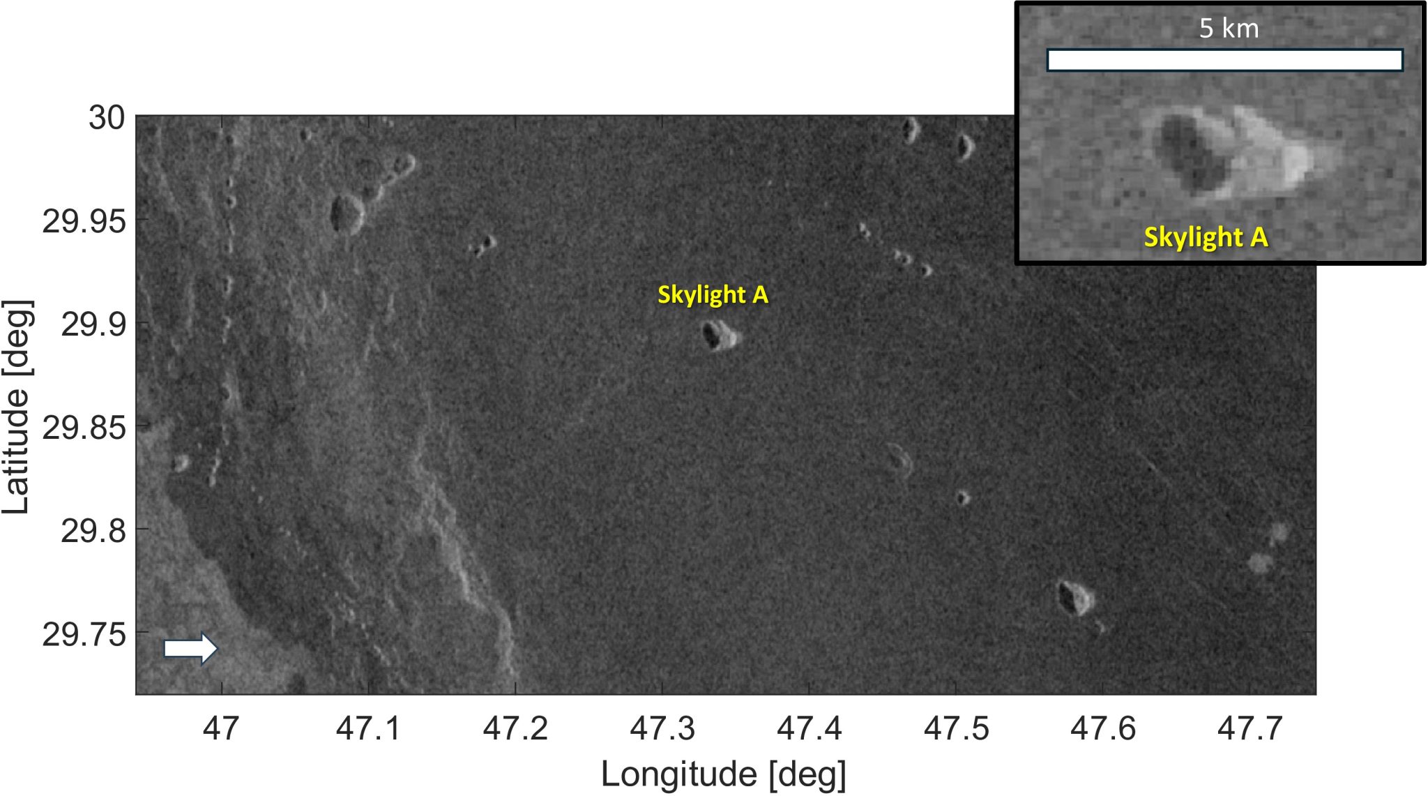 Image radar de Vénus par Magellan montrant des chaînes de puits et la 'fenêtre' identifiée, marquée A, qui pourrait donner accès au sous-sol. Crédit: Image extraite de l'article de [i]Nature Communications[/i]