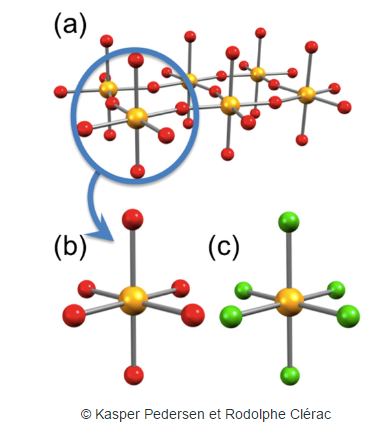 En effet, ils ont isolé une entité très proche de celle constituant les iridates: l'ion moléculaire [IrF6]2- (Figure c). Ces équipes de recherche se sont intéressées notamment aux propriétés liées au moment de spin et au moment orbitalaire de cette nouvelle molécule [IrF6]2-, c'est à dire à la manifestation "quantique" du
